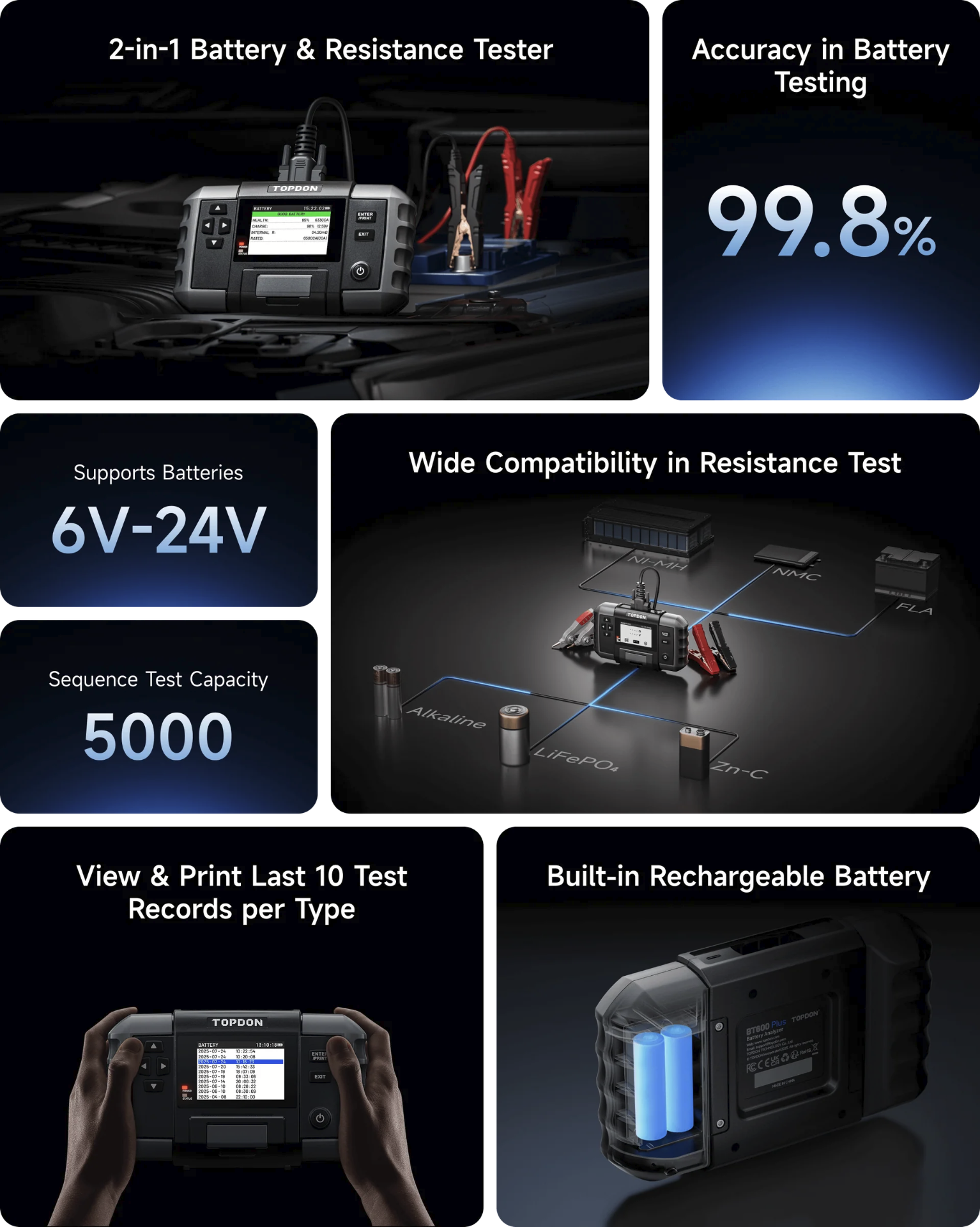 A INT-BT600 Plus egy professzionális 2 az 1-ben akkumulátor- és ellenállásmérő, amely 6 V, 12 V és 24 V-os ólomakkumulátorokat támogat 99,8%-os pontossággal. Ideális autójavító műhelyek, akkumulátor-forgalmazók és akkumulátorgyártók számára.
