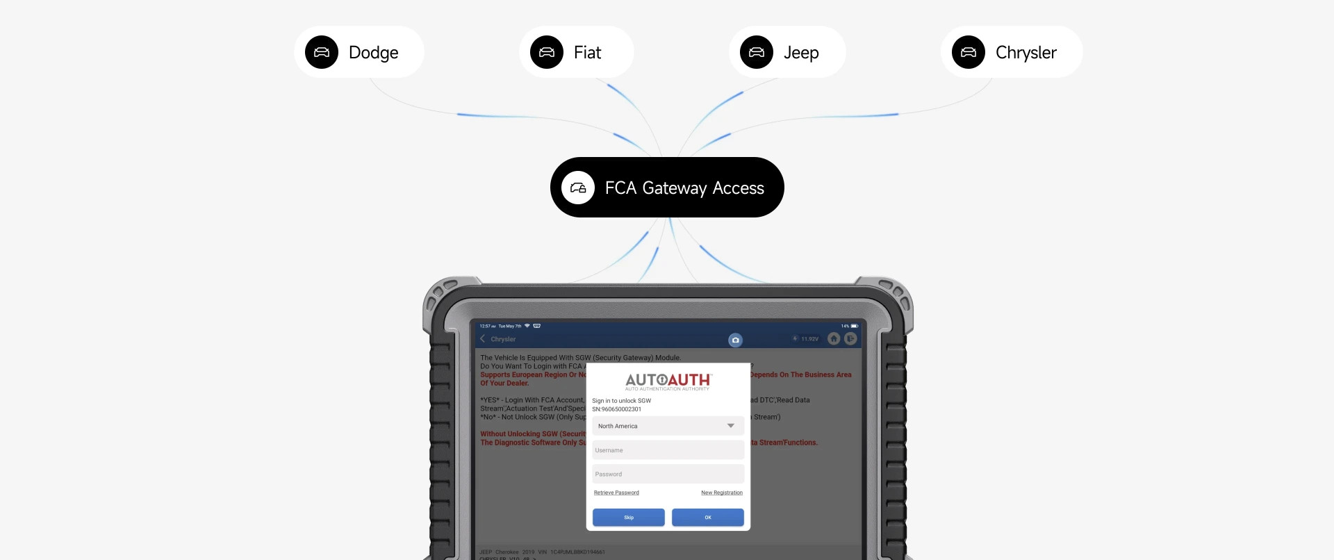 Fejlessze diagnosztikáját az FCA Secure Gateway (SGW) rendszereihez való exkluzív hozzáféréssel. Ez a megbízható funkció hozzáférést biztosít a kulcsfontosságú járműadatokhoz, lehetővé téve az FCA modellek precíz és megbízható javítását, biztosítva a magasabb szintű szolgáltatást és pontosságot.
