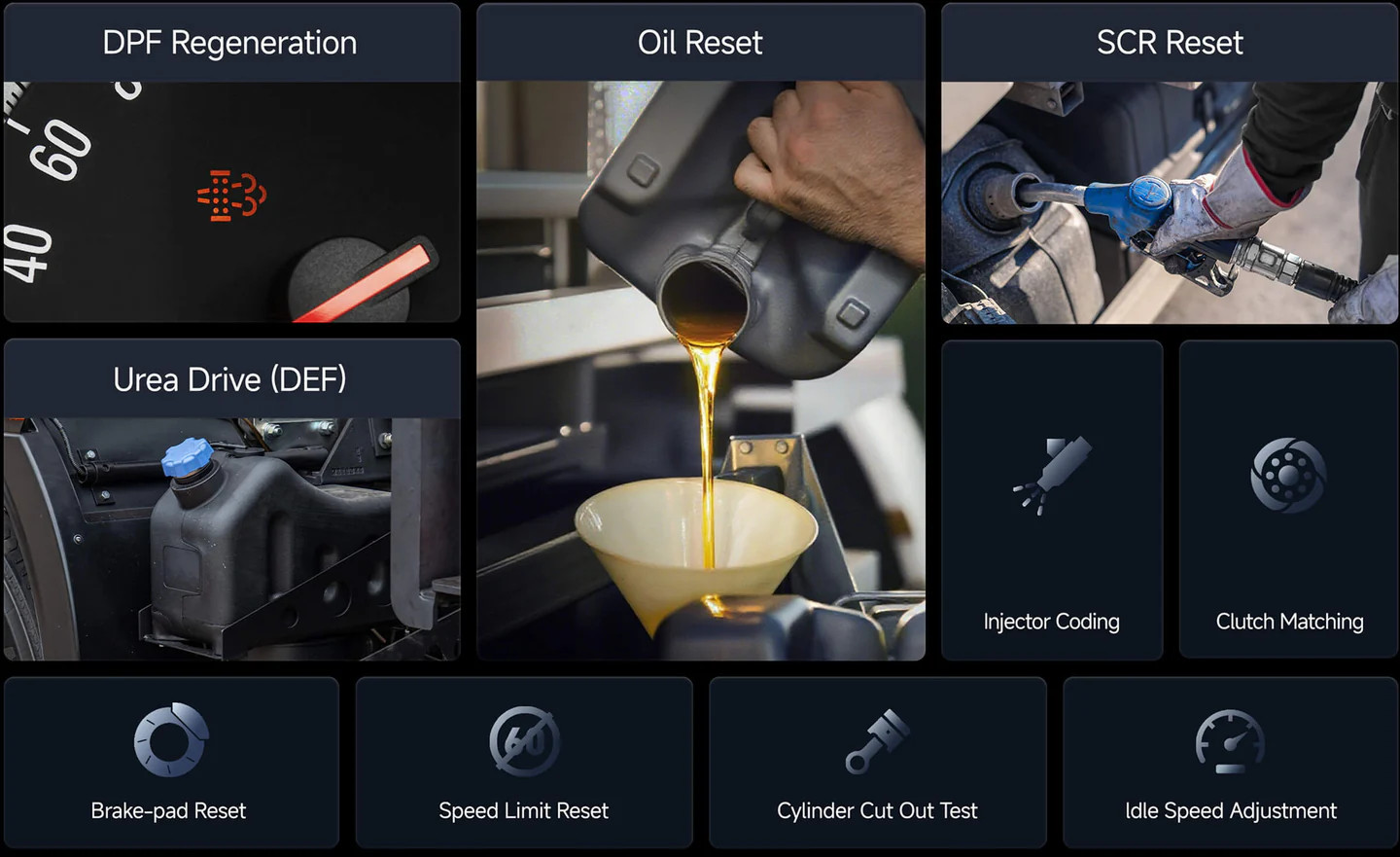 Ellátja az olyan általános karbantartási feladatokat, mint a DPF regeneráció, a karbamid szivattyú, az SCR nullázása, az olaj szervíz visszaállítása, a befecskendezőszelepek kódolása és a sebességkorlátozás be-/visszaállítása, hogy a teherautók tisztán, hatékonyan és teljes mértékben kontroll alatt működjenek.