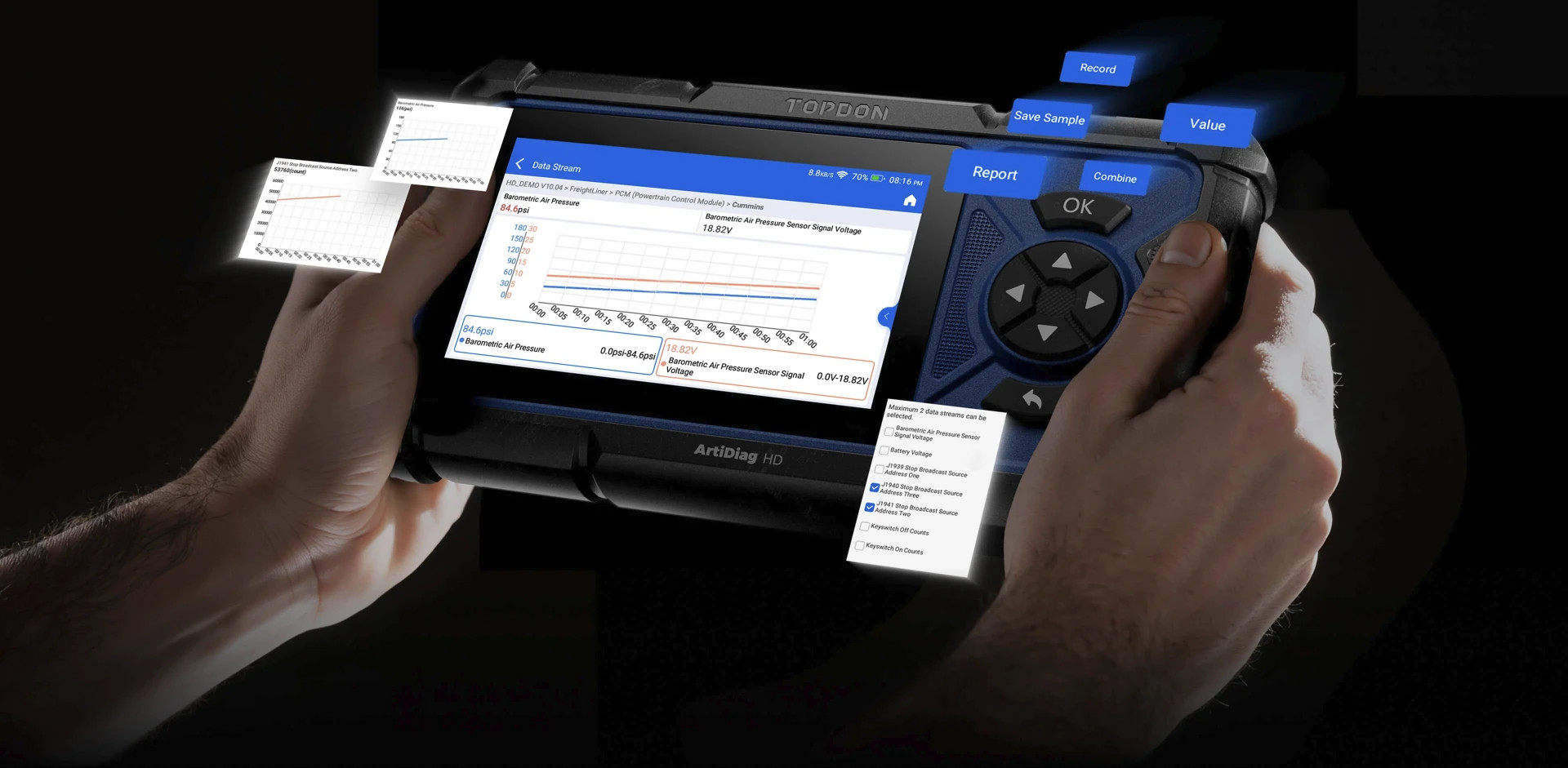 Minden járműrendszert diagnosztizál, beleértve a motort, a sebességváltót, az ABS-t, a klímaberendezést, az SCR-t, a DPF-et és egyebeket, ECU-információkkal, hibakód-olvasással/törléssel és élő-adatok elemzésével.