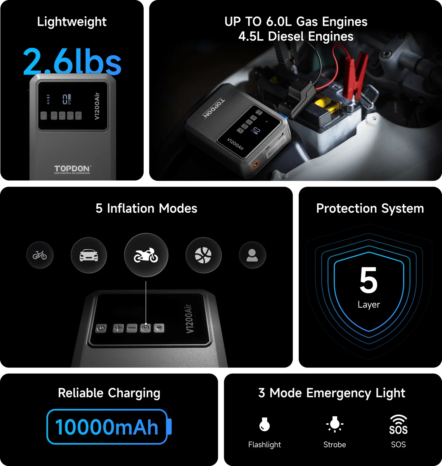 5 intelligens felfújási móddal rendelkezik a gyors és egyszerű gumiabroncs-felfújáshoz. Az 5 rétegű biztonsági védelemmel és a nagy fényerejű, 3 üzemmóddal rendelkező LED-lámpával felszerelt V1200Air a nélkülözhetetlen a mindennapokban.