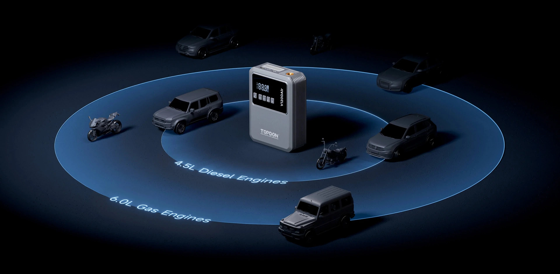 1200 A csúcsáramával ez a 2 az 1-ben indító és kompresszor 12 V-os autókat, motorkerékpárokat, hajókat és legfeljebb 6,0 literes benzin- vagy 4,5 literes dízelmotorral rendelkező gépjárműveket képes kezelni.